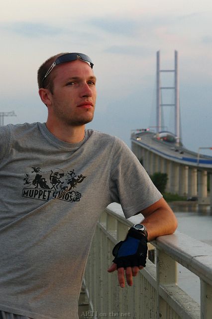 efektowny pylon (128 m wysokości), który utrzymuje jezdnię na poziomie 42 m