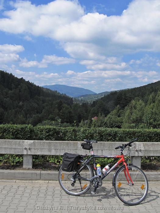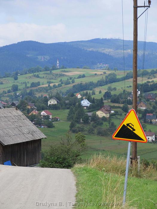 Kolejny podjazd na długo zapadnie mi w pamięci. Przeł. U Poloka (613) pokonana od strony Juszczyny daje możliwość ostrego zjazdu, bo wszystko co łyknęliśmy na 4 km oddajemy na jednym. Mój cross dociśnięty pełnymi sakwami pojechał 77 km/h a mogło być więcej. Niestety zjazd kończy się skrzyżowaniem, na którym nic nie widać, a po przeciwnej stronie jest podwórko. Trzeba hamować jak nic i najlepiej nie robić tego zbyt późno.