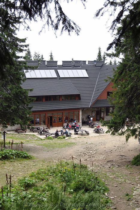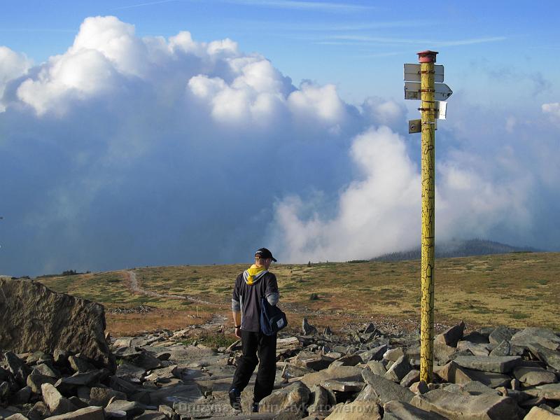 Nie chcąc ryzykować złej pogody dałem sobie podwójną szansę przezornie planując dwa dni na piesze wędrówki z Lipnicy. Lipnica Wielka ciągnie się przez 11 km z góry na dół. Z miejsca zamieszkania miałem 5,7 km do początku szlaku zielonego, skąd jeszcze 2¼ h marszu. Wyszedłem o wschodzie Słońca, bo przydługi wcześniejszy wieczór nie pozwolił mi wstać wcześniej. Południowe zbocze jest najmniej popularnym polskim wejściem na Diablak, więc turystów jest tam mniej, choć o szóstej rano to i tak nie ma znaczenia. Będąc w lesie na próżno wypatrywałem pierwszych promieni słonecznych. Zachmurzenie wzrastało i kiedy przekroczyłem górną granicę lasu wiedziałem, że będzie to marsz w chmurach. Zbliżając się do szczytu słyszałem już pierwszych turystów, którzy mieli nade mną sporą przewagę. Ze schroniska Markowe Szczawiny na północnej stronie droga na górę trwa tylko 1,5 h. Tamtędy właśnie udałem się po stempel i na posiłek. Schronisko, zbudowane od nowa w latach 2007-2009, robi wrażenie. Nie jesteśmy przywykli do takiego widoku na polskich szlakach górskich.