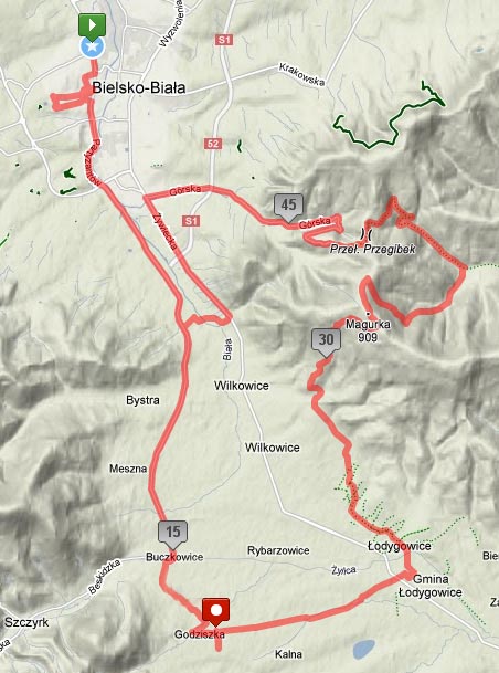 Trzy godziny snu postawiły mnie na nogi. Bez chwili zastanowienia pojechałem w stronę Magurki (909 m n.p.m.), która miała być głośnym preludium do podjazdów w dniach następnych. Podjazd do schroniska na wspomnianej górce leżącej na południowy zachód od Bielska przywołał migawki z Przeł. Karkonoskiej. Nachylenia są solidne i wystarczająco długie, żeby dać sobie w kość. W nagrodę za wysiłek w schronisku spożyłem zaniedbany tego dnia obiad. Jakie było moje zaskoczenie, kiedy zobaczyłem w lodówce Guinnessa w pusi za jedyne 9 zł, co jest ceną niższą niż spotykana w pubach (a do schroniska na górze trzeba przecież towar jakoś wwieźć). Jeśli ktoś ma wątpliwości, co było dalej, to obiad popiłem izotonikiem.