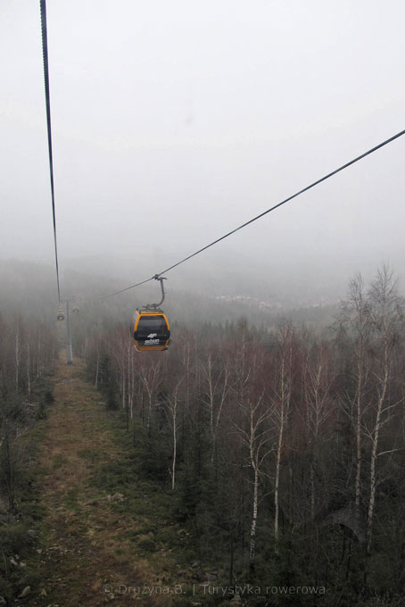 Pierwszy dzień maja rozpoczął się od nieustannie wciskanego przycisku drzemki w naszych budzikach. Co godzinę wyglądaliśmy przez okno, w nadziei, że deszcz przestanie padać. Doczekaliśmy się w końcu i po szybkim śniadaniu pojechaliśmy na stację dolną kolejki gondolowej na Stóg Izerski. Ponieważ przewóz roweru kolejką jest bezpłatny, to postanowiliśmy nadrobić stracony czas, żeby szybko dostać się na górę. Stamtąd obraliśmy azymut na wieżę widokową na Smreku, najwyższym szczycie czeskich Izerów, który w wersji językowej naszych wesołych południowych sąsiadów nie ma w nazwie żadnej samogłoski. Jak „chleb” bez „e”. Ze Stogu na Smrek postanowiliśmy jechać szlakiem pieszym, jednak szybko okazało się, że jazda możliwa jest tylko na określonych odcinkach (przynajmniej naszymi rowerami). Mimo to z uśmiechem na ustach (i z wodą w butach) dotarliśmy na wieżę, skąd rozpościerał się wspaniały widok na chmury piętra niskiego z tu i ówdzie pojawiającymi się, niczym grzyb na ścianach łazienek naszej kwatery, prześwitami.